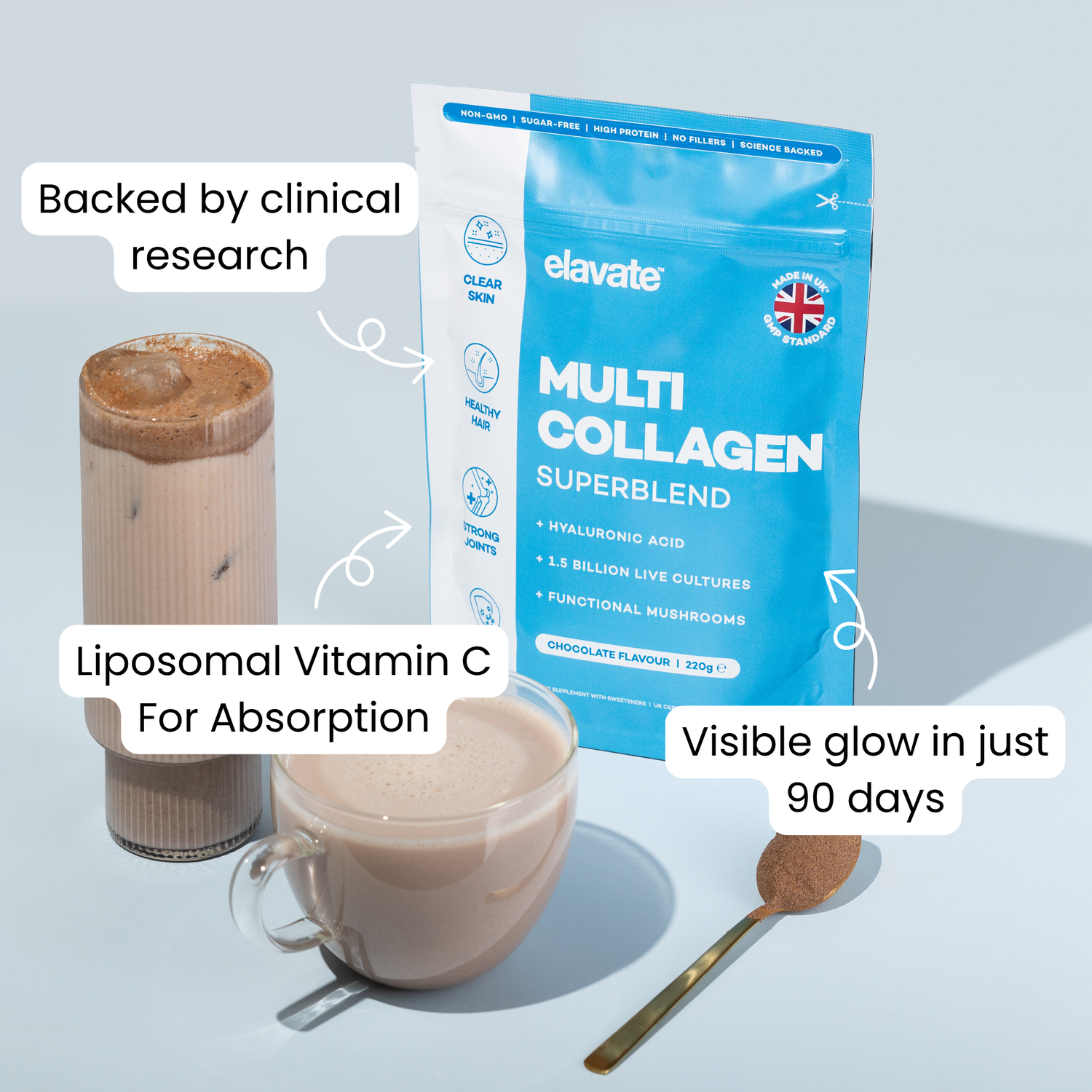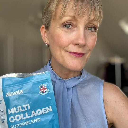 After menopause, it's common to experience changes in skin elasticity, joint comfort, and overall energy. Elavate’s unique blend of collagen and supportive nutrients helps address these concerns. It includes multi-collagen peptides for skin, joints, and bones, B vitamins to support energy and metabolism, hyaluronic acid for skin hydration and plumpness, and liposomal vitamin C to aid collagen absorption and support immunity.